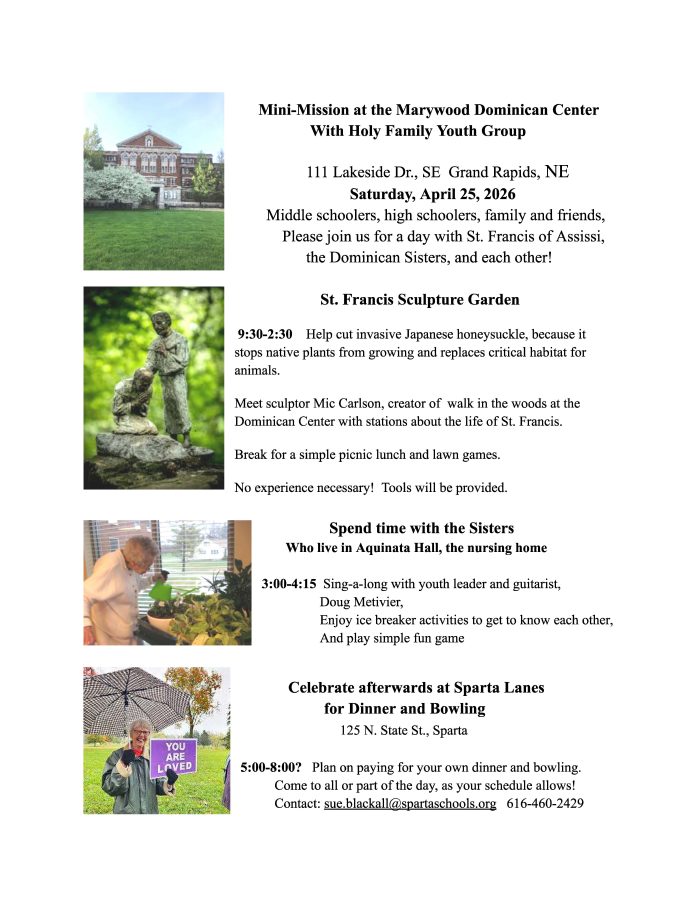 Middle and High School Students, and their friends, are invited to the Youth Group Mini-Mission on April 25, 2026. We will travel to the Marywood Dominican Center in Grand Rapids to remove invasive plants from the St. Francis Sculpture Garden and spend with the Dominican Sisters. Afterwards, we’ll head back home to Sparta and enjoy a dinner and fun event at Sparta Lanes.